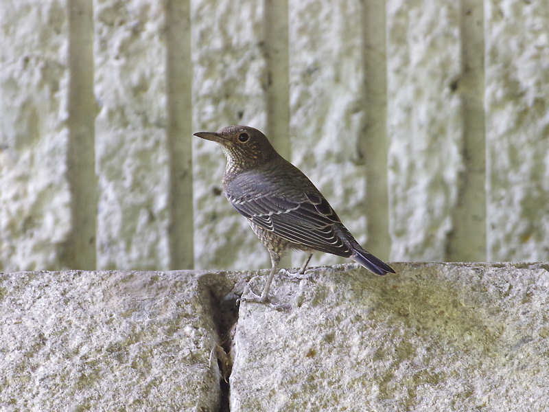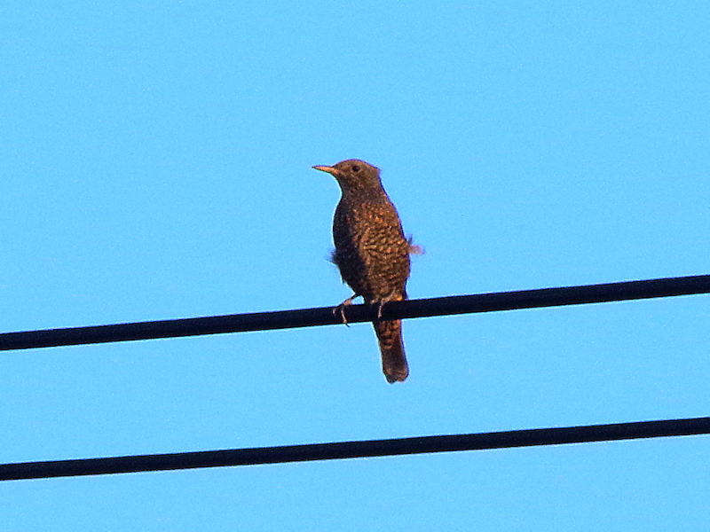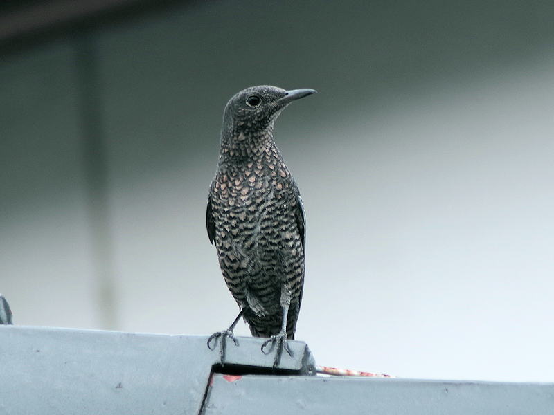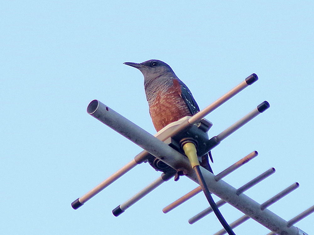 イソヒヨドリがやってきた (心ならずも子育て支援) 目次に戻る 2025年5月 イソヒヨドリの基本情報 イソヒヨドリは名前の通り日本では海岸の岩礁地帯で見掛けることが多いが、ヨーロッパ南部から 日本にかけてのユーラシア大陸南部の内陸部から海岸地方に掛けて生息する。 世界的には野山 の鳥に分類され、日本でも内陸部への進出傾向が見られる。 ヨーロッパから中央アジアにかけての一帯で繁殖する個体群は冬季は南アジア・アフリカにに渡っ て越冬する渡り鳥であるが日本では留鳥である。 北海道では夏鳥。 1,プロローグ 野鳥の世界に飛び込んだ約20年前、いろいろと教えていただいた野鳥界の先輩から昆虫の飼育 箱に入った飼育中のミルワームを一箱いただいた。 「冬になったらジョウビタキが来るから朝晩出してやるといい」 野鳥に餌付けするのは生態系を乱すから良くない・・と言われているけど「庭に野鳥を呼ぼう」という 趣旨で野鳥の会が「バードフィーダー」というエサ台を販売しているので差し支えないと判断した。 バードフィーダーで小鳥たちに給餌するのとどこが違うというのか・・・という感じである。 その冬、庭でジョウビタキを見かけたので餌を出してやったら数日で餌付いた。 うちで出してやる 餌に依存しないように1回に出すミルワームの量は朝夕とも10匹以下に制限した。 餌を出すことで春の渡りが遅れないか心配したけど、渡りに備えて体力を付けるため餌が欲しいと 顔を出す回数が増えた3月20日前後にジョウビタキは北の繁殖地へ帰っていった。 ミルワームは餌になるフスマ(小麦をむいた皮・20kg・700円くらいで長期保存が効いた)を農協 で買ってきて自分で飼育して増やした。 2,イソヒヨドリがやってきた ジョウビタキは厳しい縄張りを持つので庭に来るのは♂だったり♀だったりするものの1羽づつだった。 2023年の12月、僅か10匹のミルワームを上品に食べ残して何度も食べにくるジョウビタキと違い、 出した餌がすぐに無くなることから別の鳥が食べているのに気付いた。 そして12月8日にイソヒヨドリ が餌を食べているのを確認し、12月10日に写真撮影に成功した。 1回目の冬を迎えている♂の若鳥だった。 ![]() 長期滞在はしないだろうとの予想を裏切ってイソヒヨドリの若(1W)はジョウビタキの餌を横取りしなが ら庭に居座ってしまった。 成鳥にはみられない白点が肩羽・大雨覆い・初列雨覆い・雨覆いの先端に見られ、喉から胸は薄青 色。 下面は汚れたレンガ色で成鳥の美しさは全くない。 イソヒヨドリの幼鳥が成鳥羽に向かってどう換羽してゆくのか見ることにし、ジョウビタキより体が大きい ので朝晩の餌を15匹に増やして給餌を続けた。 12月22日に撮影。 ![]() 庭に現れてから1ヶ月目の2024年1月11日の撮影。 露出がアンダー気味であるが1ヶ月前 と殆ど変わっていない。 ![]() 1月27日 背中の波模様が薄くなり、雨覆いの白点が薄くなってきた。 胸のレンガ色が明るく範囲が 広くなって奇麗になってきた。 部分的に換羽している。 イソヒヨドリは人に懐きやすいと言われるよう に餌を出すときは近くまで寄ってきて次第に鳥との距離が近くなった。 ![]() 2月2日 同じポーズが多いけど時にはこんなパフォーマンスも見せるようになった。 ![]() 2月23日 朝と夕方になると隣家の屋根の上で給餌を待つようになった。 この時期は太陽の沈む 方向が真西より南側にあるため夕方の光線を浴びて赤っぽく写るけど撮りやすかった。 現れたころと比べると背中の白点は摩耗によって次第に薄くなって下面のレンガ色がさらに明るく なり、胸の青色部分とレンガ色の部分の境目がはっきりしてきた。 レンガ色の中にあった青い横線もかなり薄くなっているのは幼羽が抜けて成鳥羽への換羽が進んで いるから。 全体的に背中の青色が暗い青色から明るいブルーに変わってきて更にきれいになった。 ![]() 3月11日 庭に現れてから3カ月が経った。 2月3日撮影の写真から16日経って背羽や雨覆い は摩耗して白っぽい部分は殆ど無くなり、初めて来た頃とは別の鳥にように美しくなった。 雨覆いの先端も摩耗が進んで白い羽先が僅かしか残っていない。 大部分の野鳥は年に1回換羽する。 その時期は繁殖が終わってからとされているので幼羽が抜け て本来の色が見え始める部分換羽を行っているから。 ![]() 3月20日 下面はメラニン色素によるレンガ色で胸や上面は構造色と言われる羽の構造によって 青く見えている。 下面に若干青い横斑が残っているが現れた時と比べると大幅に減っている。 メラニン色素と構造色は色の成り立ちが違うから青い羽がレンガ色に変わることは無い。 青い羽は幼羽で少しづつ抜けてレンガ色が鮮やかに見えるようになった。 背中の濃い青も次第に 抜けて成鳥に見られる奇麗な青色が残った。 ![]() この後、3月26日を最後に繁殖地に行って姿を見せなくなった。 この時は1歳の若鳥が繁殖に入る とは思っていなかった。 3, 翌 2,024年の秋 11月22日、遊びに来た孫息子